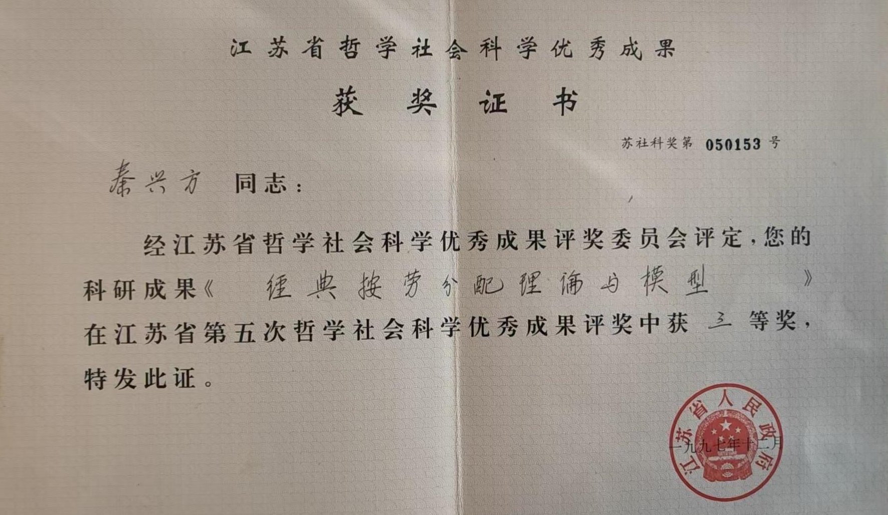 成果名称:经典按劳动分配理论与模型